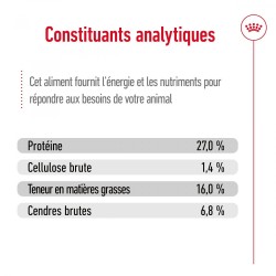 CONSTITUANTS ANALYTIQUES: Protéine: 27,0 % - Matières grasses brutes: 16,0 % - Cendres brutes: 6.8 % - Cellulose brute: 1,4 %  - Énergie métabolisable : 3912 kcal/kg.