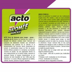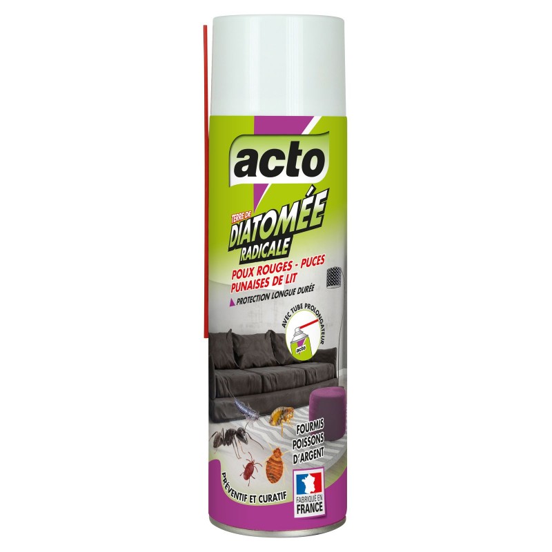• Contre les insectes rampants : poux rouges, puces, punaises de lit, fourmis, poissons d'argent, cafards, blattes, cloportes… • Agit par contact : la terre de diatomée, composée de fossiles d'algues microscopiques très coupants, blesse les insectes et provoque des lésions de leurs membres, de leur carapace et de leur tube digestif. Insectes et larves meurent en quelques jours par déshydratation. • Protège la zone traitée jusqu'à 2 à 3 semaines. • Préventif et curatif. • Avec tube prolongateur pour atteindre les zones difficiles d'accès.