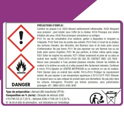MENTIONS OBLIGATOIRES: Avant toute utilisation, lisez l'étiquette et les informations concernant le produit. DANGER Contient du propan-2-ol. H222 Aérosol extrêmement inflammable. H229 Récipient sous pression : peut éclater sous l'effet de la chaleur. H319 Provoque une sévère irritation des yeux. H336 Peut provoquer somnolence ou vertiges. P101 En cas de consultation d'un médecin, garder à disposition le récipient ou l'étiquette. P102 Tenir hors de portée des enfants. P210 Tenir à l'écart de la chaleur, des surfaces chaudes, des étincelles, des flammes nues et de toute autre source d'inflammation. Ne pas fumer. P211 Ne pas vaporiser sur une flamme nue ou sur toute autre source d'ignition. P251 Ne pas perforer, ni brûler, même après usage. P261 Éviter de respirer les aérosols. P271 Utiliser seulement en plein air ou dans un endroit bien ventilé. P305+P351+P338 EN CAS DE CONTACT AVEC LES YEUX : Rincer avec précaution à l'eau pendant plusieurs minutes. Enlever les lentilles de contact si la victime en porte et si elles peuvent être facilement enlevées. Continuer à rincer. P312 Appeler un CENTRE ANTIPOISON ou un médecin en cas de malaise. P403 Stocker dans un endroit bien ventilé. P410+P412 Protéger du rayonnement solaire. Ne pas exposer à une température supérieure à 50°C/122°F. P501 Éliminer le récipient avec ou sans reliquat de produit dans une déchetterie. Ne pas jeter dans les ordures ménagères. Procéder par brèves pressions, sans pulvérisation prolongée.