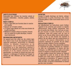 MENTIONS OBLIGATOIRES: Lire attentivement ces instructions avant d'utiliser l'appareil. Usage intérieur uniquement. Tenir hors de portée des enfants. Ceci n'est pas un jouet. Ne pas toucher la grille électrique en cours d'utilisation. Eviter tout contact avec de l'eau et stocker au sec. Ne pas utiliser dans la salle de bains, ni dans un lieu où sont stockés des explosifs et artifices. Ne pas utiliser dans des emplacements où la présence de vapeurs inflammables ou de poussières explosives est probable. Ne pas utiliser dans les granges, étables et locaux analogues. Remarques sur les piles : Elles doivent être insérées en respectant les polarités indiquées sur l'appareil. Les piles non rechargeables ne doivent pas être rechargées. Les différents types de piles ou les piles neuves et usagées ne doivent pas être mélangés. Les piles usagées doivent être retirées de l'appareil et rapportées au point de vente où elles ont été achetées pour entrer dans le système de recyclage ou déposées en déchetterie. Si l'appareil n'est pas utilisé pendant une longue période, il convient de retirer les piles. Les bornes d'alimentation ne doivent pas être court-circuitées.