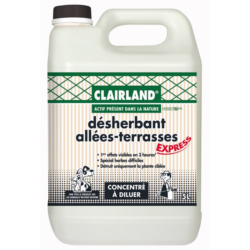 Désherbant de contact non sélectif destiné au désherbage de vos allées et terrasses. Formulation INNOVANTE à base d'un principe actif présent dans la nature : L?acide pélargonique. existant notamment dans les géraniums. Détruit les mauvaises herbes en place avec un effet visible en moins de 3 heures. Retour rapide des animaux domestiques sur la surface traitée.