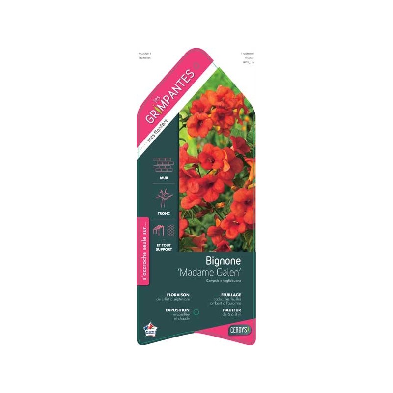 Cette bignone chinoise est une plante grimpante caduque de croissance rapide, s'élevant jusqu'à 7m à l'aide de ses rameaux munis de quelques racines aériennes qui s'accrochent un peu comme du lierre. Elle affiche, en fin d'été et en début d'automne, des bouquets spectaculaires de fleurs écarlate à vermillon, pâlissant en orangé, en forme de grandes trompettes largement évasées. Cette floraison est mise en valeur par un beau feuillage découpé d'un vert foncé.
